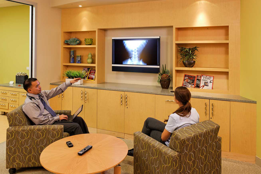 At the LifeConnections Center advanced technologies are designed to improve patient flow and the overall patient experience. Easy self check-in lets employees walk right to their room and avoid sitting in a waiting room with colleagues. Caregivers can access electronic health records, lab results or supporting information through laptops, mobile devices or displays, to provide flexibility in when and how they access patient information. The facility also supports HealthPresence, high-definition video consultations with those who live a distance from the Center or might be traveling.